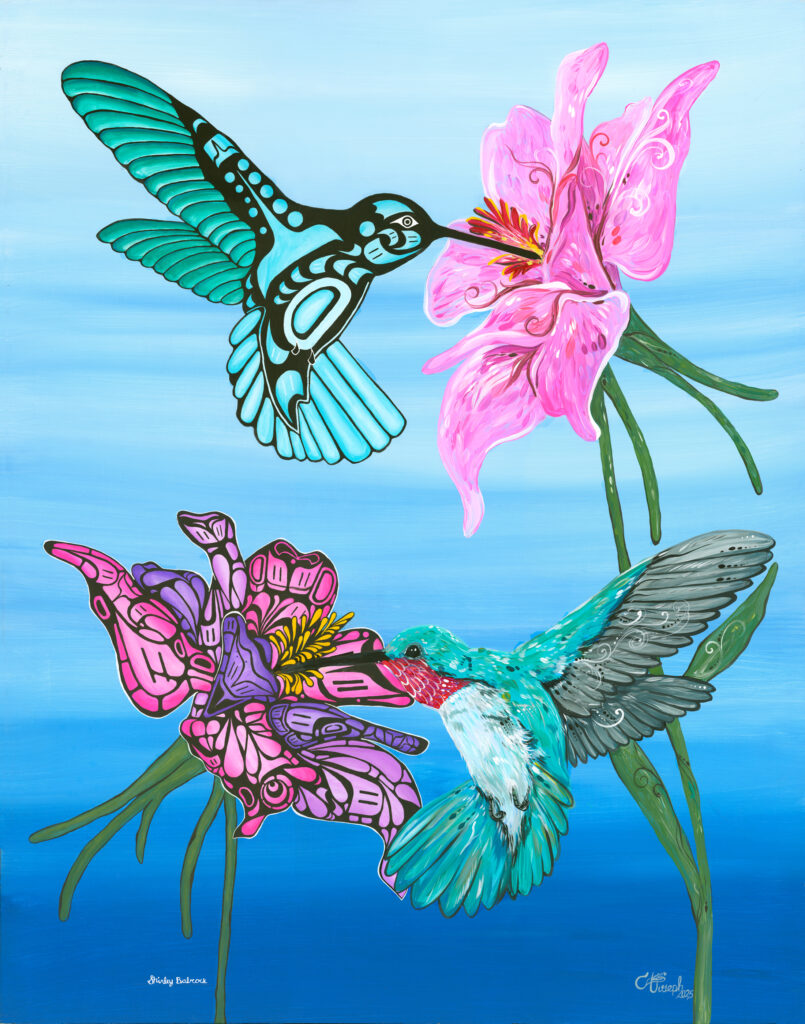 SOLD (large print available) Joint Effort – Hummingbirds, Shirley Babcock/Carla Joseph Available on Display at the Coast Inn of the North, Prince George. Click to view A cute little AI generated video.
